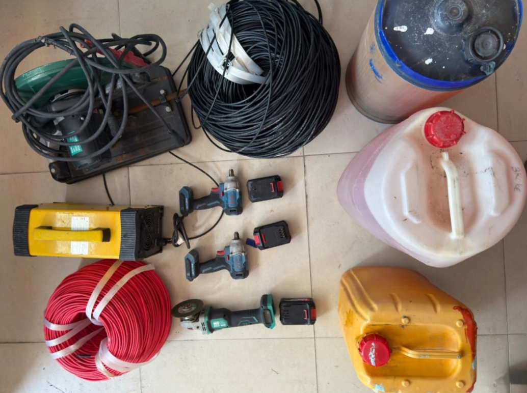 އޭގެ ތެރޭގައި 1000 މީޓަރު ކޭބަލް، ކަޓްއޯފްއަކާއި ވެލްޑިން ޕްލާންޓަކާއި ޕެޓްރޯލް ހަންތަކަކާއި އޭންގަލް ގްރޭންޑަރެއްގެ އިތުރުން ބެޓްރީ ރެންޗުތަކެއް ހިމެނޭ ކަމަށް ފުލުހުން ވަނީ ބުނެފައެވެ.