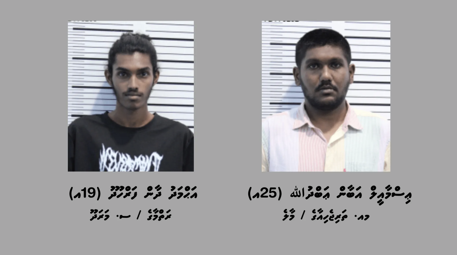 މި މައްސަލައިގައި ފުލުހުން ހައްޔަރުކޮށްފައިވަނީ މއ. ތަރިޖެހިއާގެ، އިސްމާއީލް އަބާން އަބްދުﷲ (25އ) އަދި ސ. މަރަދޫ، ރަތްމާގެ، އަހްމަދު ދާން ފަރްހޫދު (19އ) އެވެ.