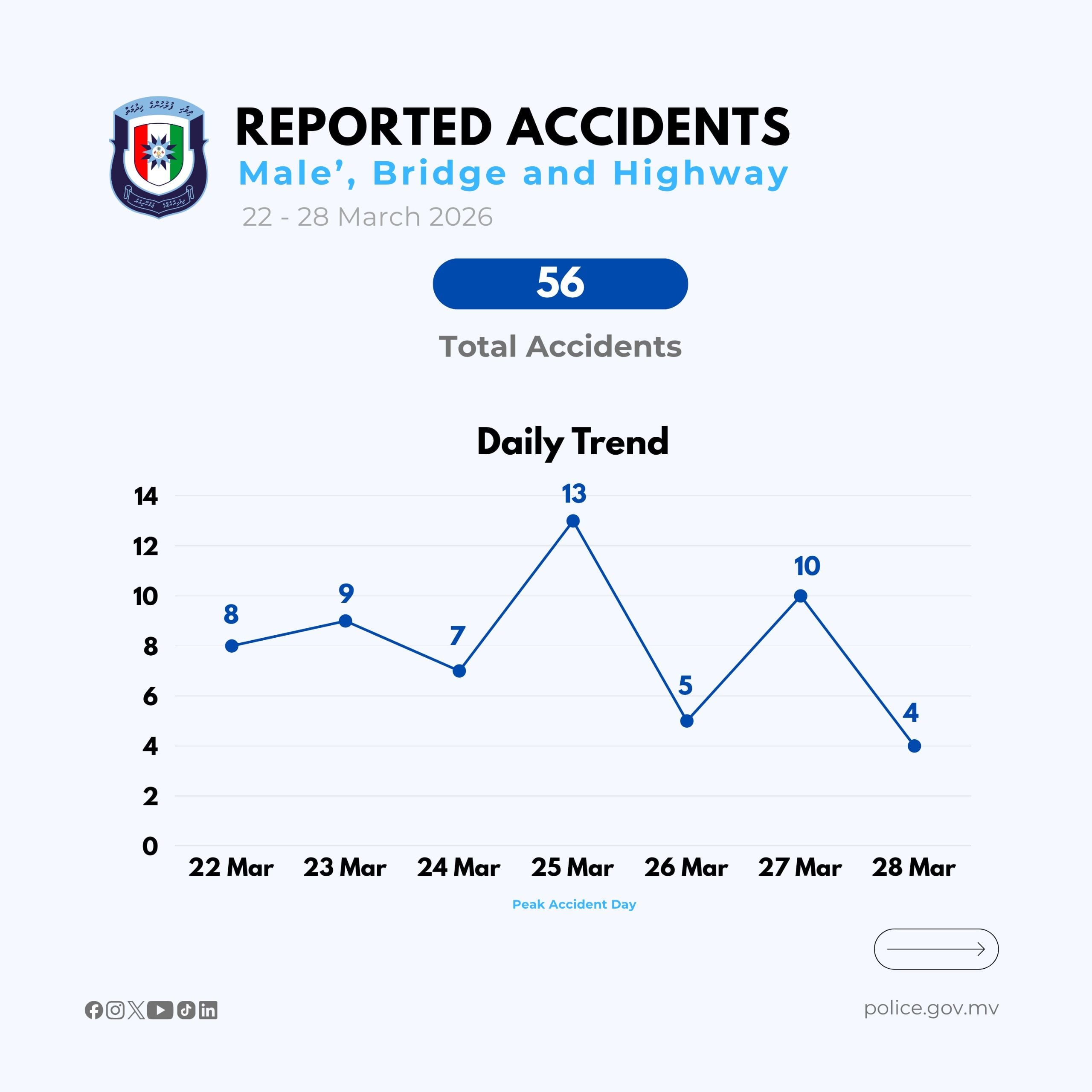 ފުލުހުން އާންމުކޮށްފައިވާ ތަފާސް ހިސާބުތަކަށް ބަލާއިރު މާރޗް 22 އިން 28 އަށް މާލެ ސަރަހައްދުގައި ޖުމުލަ 56 އެކްސިޑެންޓެއް ވަނީ ހިނގާފައެވެ. މީގެ ތެރެއިން އެންމެ ގިނަ އެކްސިޑެންޓް ހިނގާފައިވަނީ މާލޭގެ މަގުތަކުގައެވެ. އެގޮތުން މާލޭގައި އެކަނިވެސް 49 އެކްސިޑެންޓް ހިނގާފައިވާކަމަށް ފުލުހުން ބުނެއެވެ.