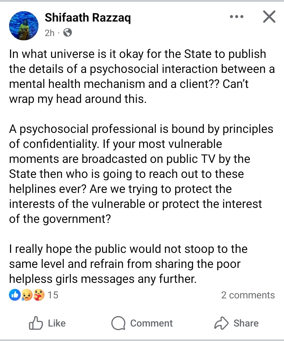 ދަނާލުގައި ނިޔާވި ދަރިވަރު ނަފްސާނީ ހެލްޕްލައިންއަށް ފޮނުވި މެސެޖުތައް ނޫސްވެރިންނާ ހިއްސާ ކުރުމާ ގުޅިގެން، ހިއުމަން ރައިޓްސް ކޮމިޝަން އޮފް ދަ މޯލްޑިވްސް (އެޗްއާރްސީއެމް)ގެ ކުރީގެ މެމްބަރު ޝިފާތު ރައްޒާގު ކަންބޮޑުވުން ފާޅުކުރައްވައިފިއެވެ.