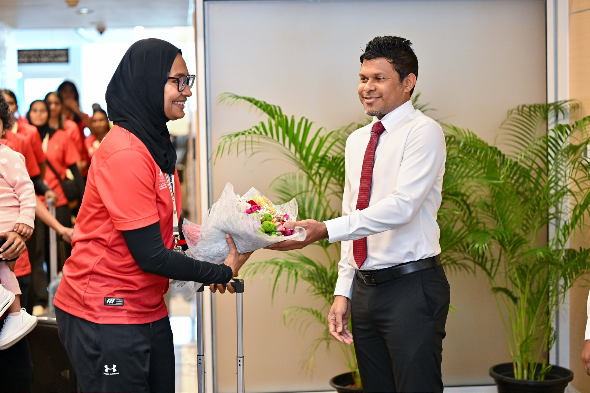 Vice President Uz Hussain Mohamed Latheef welcomed the Maldives women’s national basketball team upon their arrival at Velana International Airport after their historic achievement at the 3rd SABA Women’s Basketball Tournament, where they secured the silver medal.