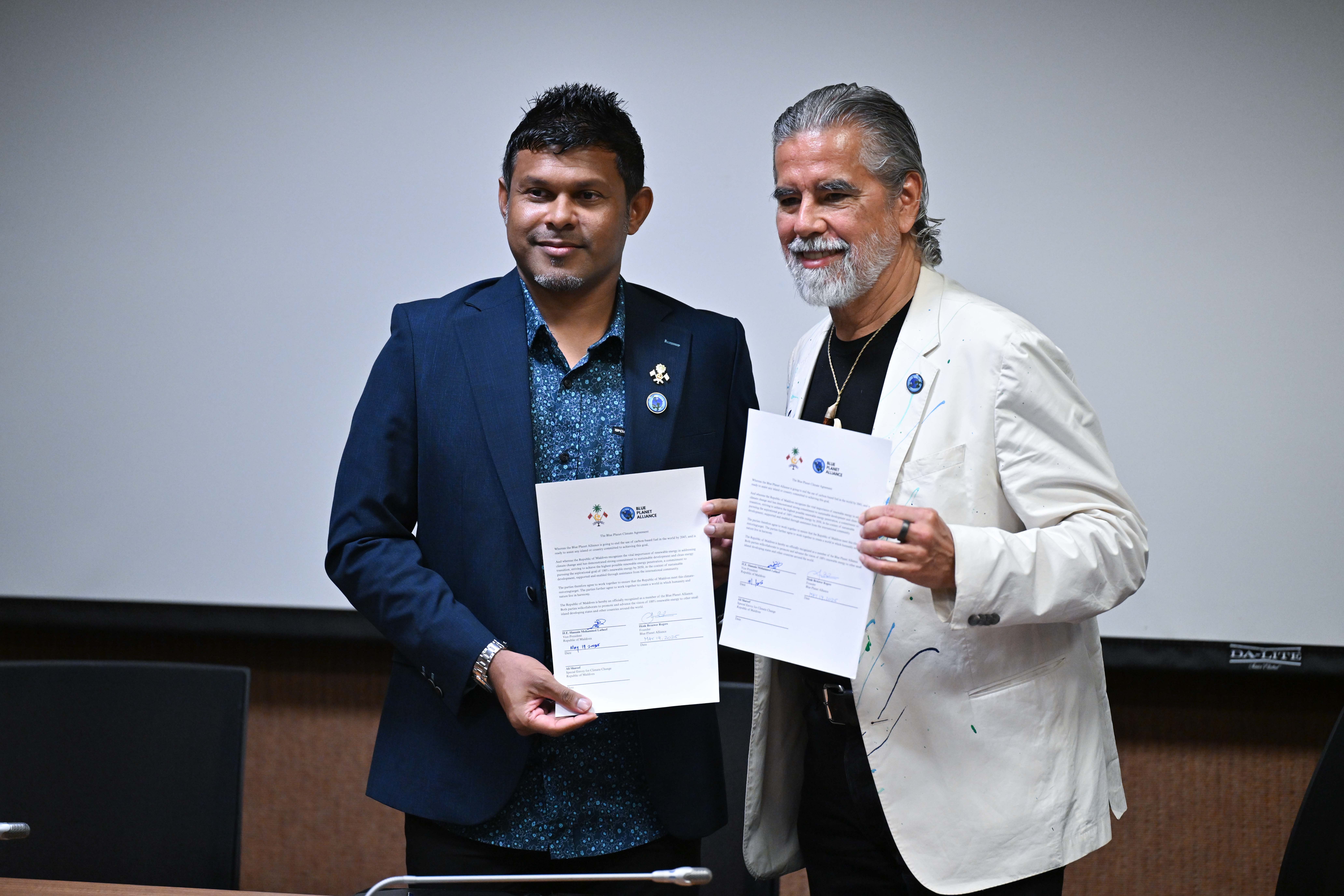 The signing took place on May 19 on the sidelines of the Blue Planet Alliance Fellowship Programme in Honolulu, Hawaii. Vice President Uz Hussain Mohamed Latheef signed the agreement on behalf of the Maldives, while BPA Founder Henk Rogers signed on behalf of the organization.