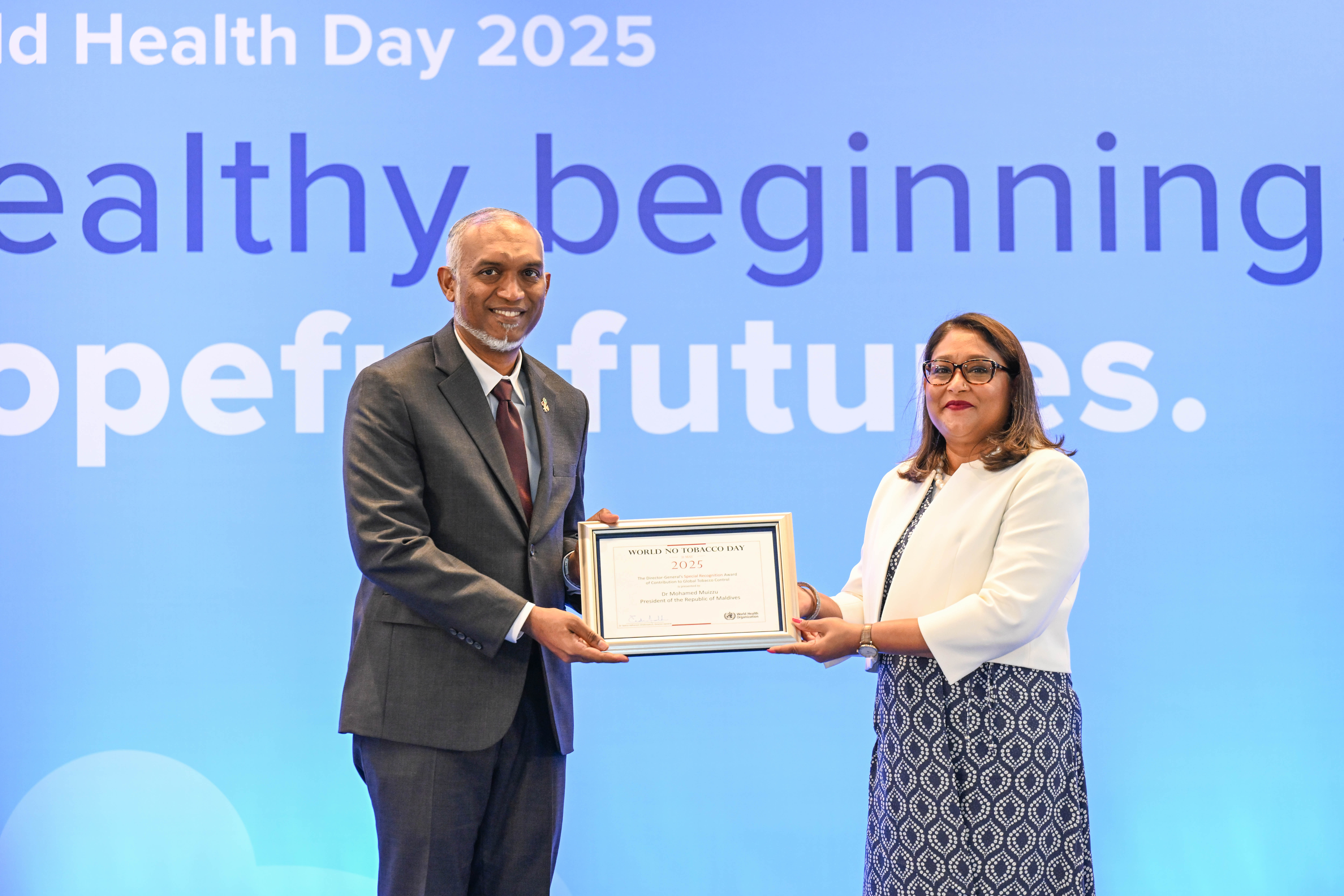 President Dr. Mohamed Muizzu has received the World No-Tobacco Day Special Recognition Award from the World Health Organization (WHO), celebrating his leadership in advancing tobacco control in the Maldives.