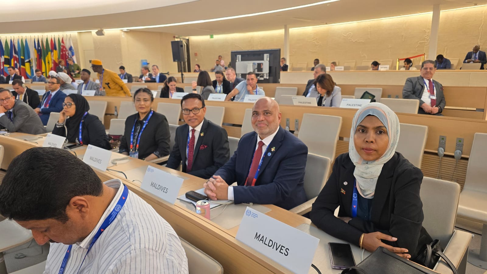 The Maldives national delegation expressed pride in standing with Palestine in support of the resolution, describing the moment as a significant step in recognizing the rights and dignity of the Palestinian people within the international labour community.