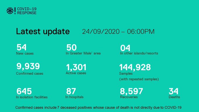 September 24th; (HPA) Health Protection Agency of the Maldives; reports 54 positive cases within 24 hours. This includes 30 Maldivians and 24 Foreigners.