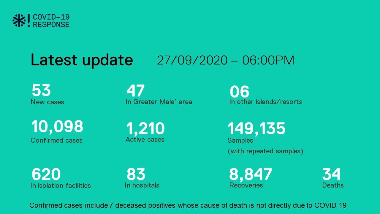 September 27th; (HPA) Health Protection Agency of the Maldives; reports 53 positive cases within 24 hours. This includes 42 Maldivians and 11Foreigners.