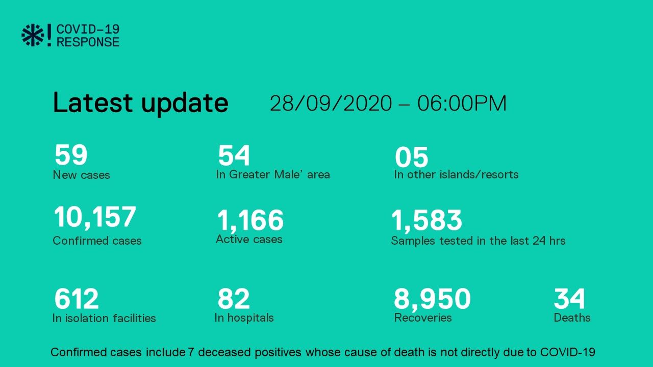 September 28th; (HPA) Health Protection Agency of the Maldives; reports 59 positive cases within 24 hours. This includes 47 Maldivians and 12 Foreigners.
