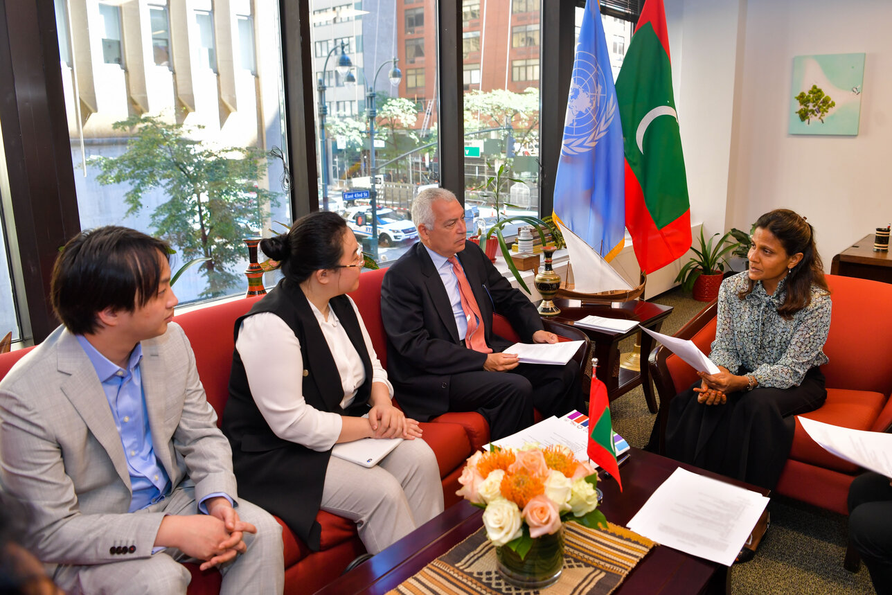 H.E First Lady Fazna Ahmed has met with H.E Marco Suazo, Head of United Nations Institute for Training and Research (UNITAR) New York Office, Ms. Lucia J. Guo, Executive Director of the Global Foundation for the Performing Arts (GPFA), and Mr. Byron Zhou, Pianist on the artist roster of the GFPA.