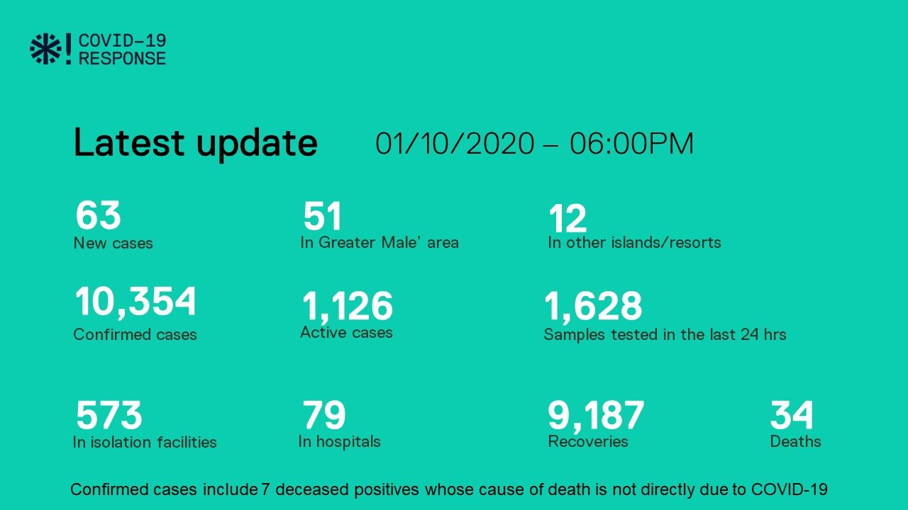 October 1st; Health Protection Agency of the Maldives (HPA) reports 63 positive cases within 24 hours. This includes 31 Maldivians and 32 Foreigners.