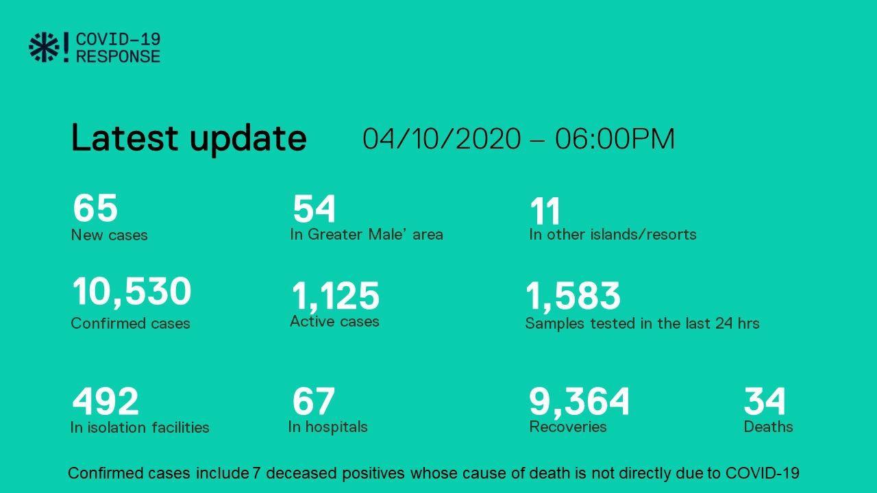 October 4th; Health Protection Agency (HPA) of the Maldives reports 65 positive cases from 1,583 samples taken within 24 hours. This includes 51 Maldivians and 14 Foreigners.
