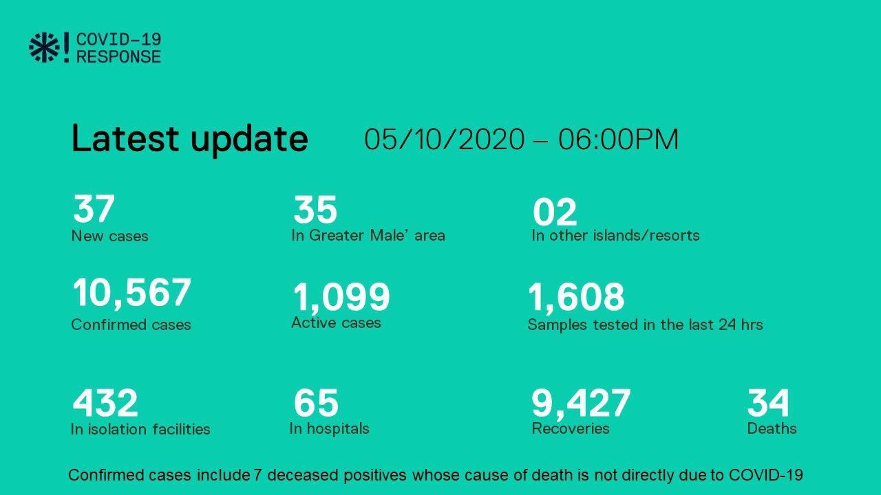 October 5th; Health Protection Agency (HPA) of the Maldives reports 37 positive cases from 1,608 samples taken within 24 hours. This includes 29 Maldivians and 08 Foreigners.