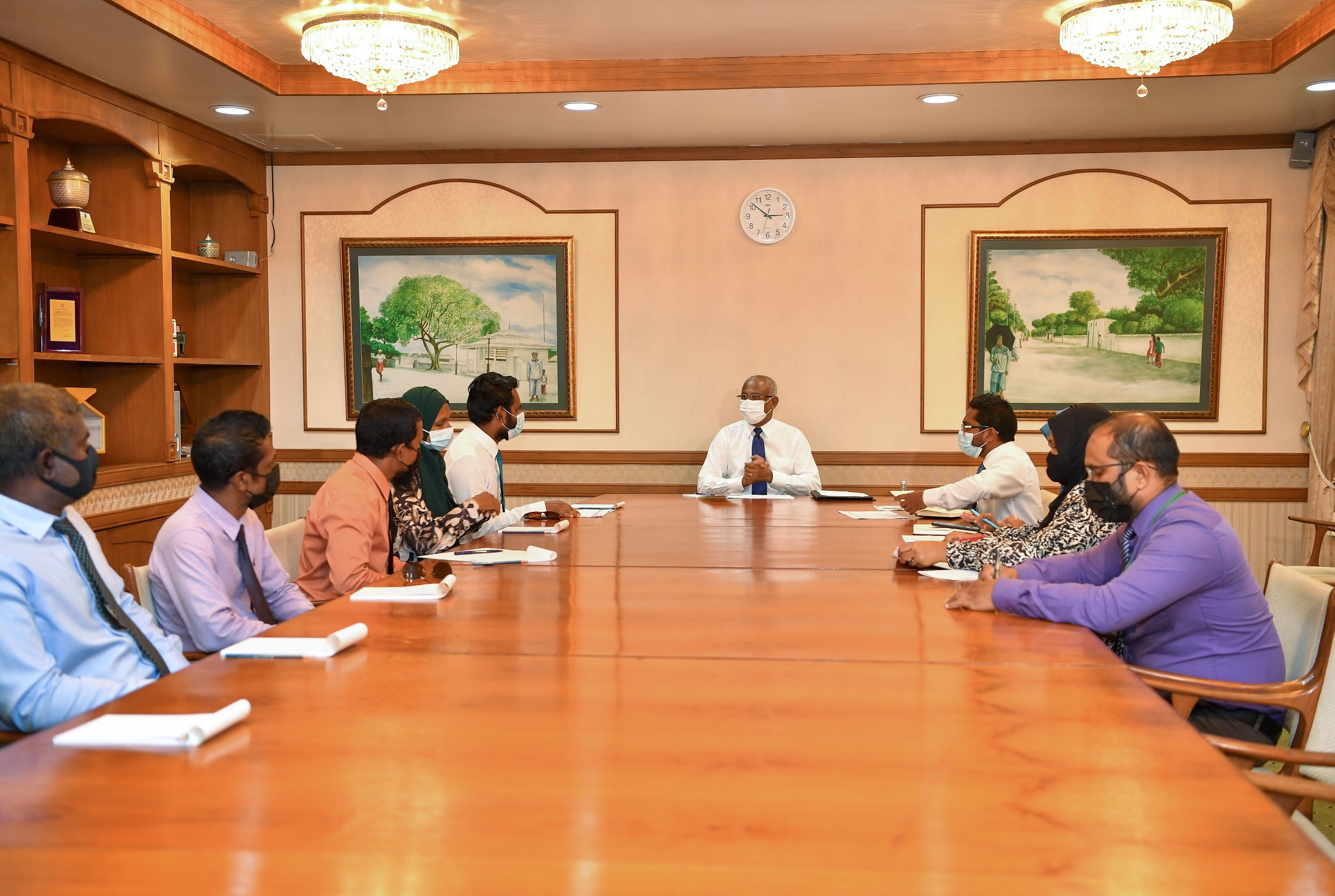 President Ibrahim Mohamed Solih on Sunday afternoon met with members of the Dhiffushi Island Council of Kaafu Atoll. The meeting was held this afternoon at the President's Office, where the council members shared the most pertinent needs and concerns of the residents.