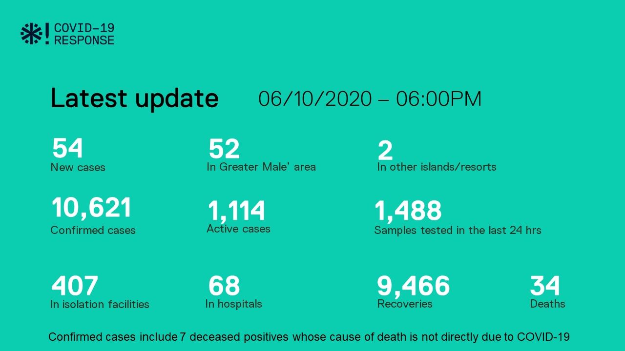 October 6th; Health Protection Agency (HPA) of the Maldives reports 54 positive cases from 1,488 samples taken within 24 hours. This includes 45 Maldivians and 09 Foreigners.