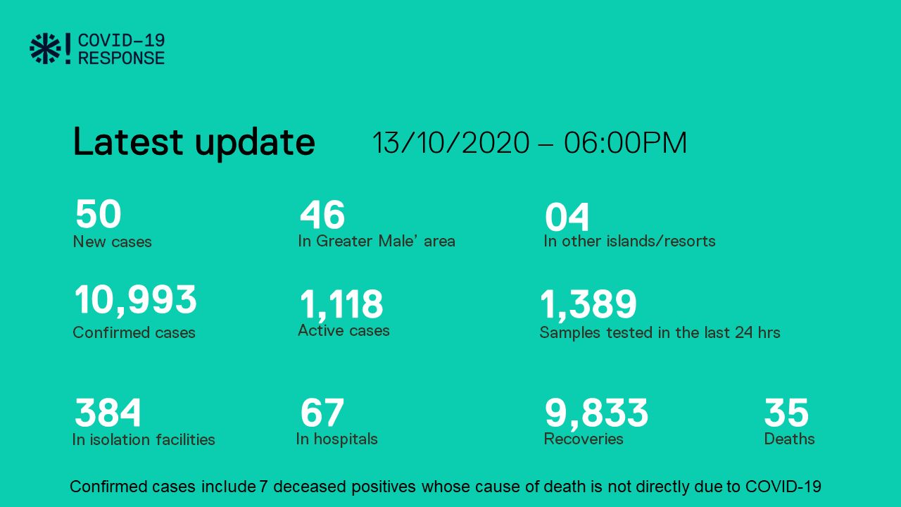 October 13th; the Health Protection Agency (HPA) of the Maldives reports 50 positive cases from 1,389 samples taken within 24 hours. This includes 48 Maldivians and 02 Foreigners.