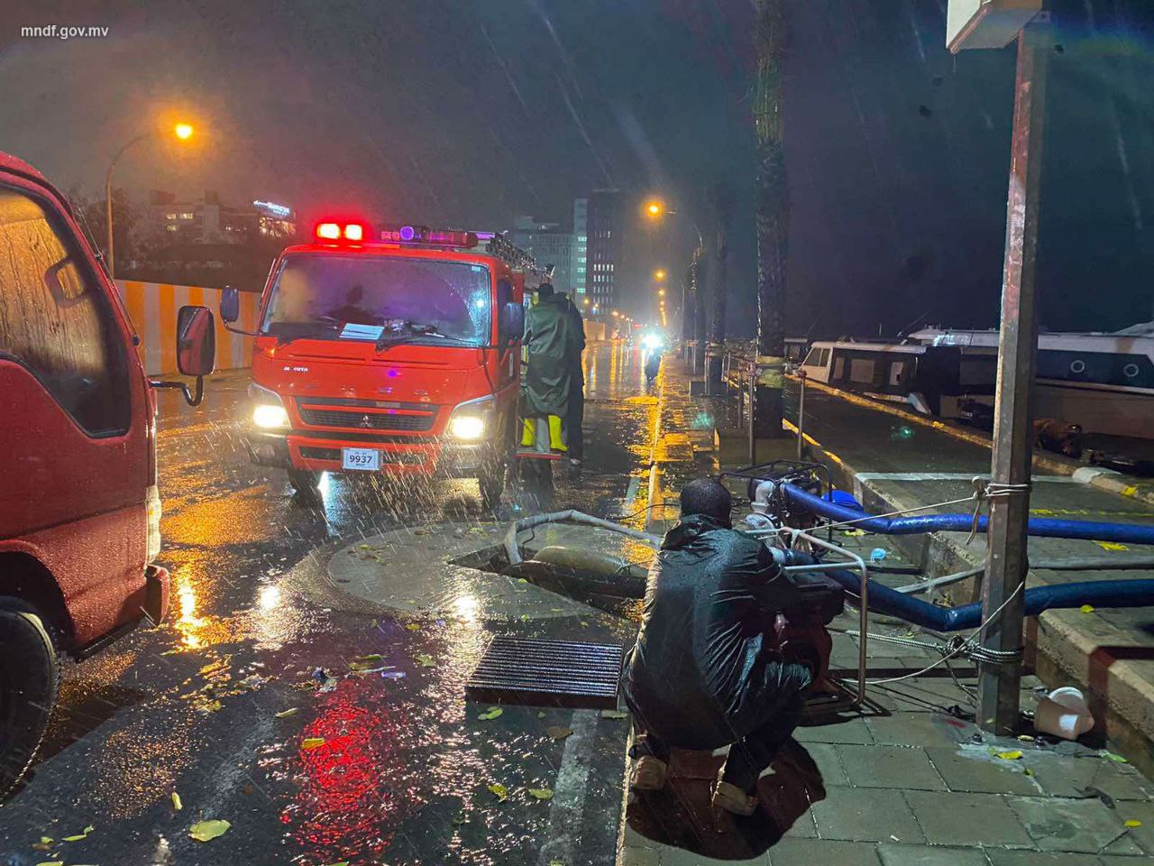 FRS officers have been installing pumps to drain the flooded water near the running track area, boduthakurufaanu Magu since 17:30 pm today, said MNDF. FRS officers are also working to drain the flood waters in the IGMH area.