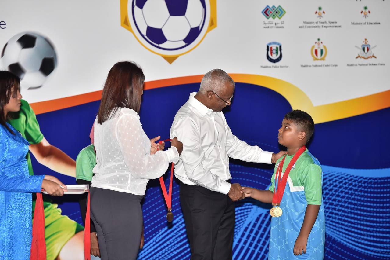 President Ibrahim Mohamed Solih on Saturday attended the closing ceremony of the Nestlé Kids’ Football Fiesta. The tournament was held at the Henveiru Football Stadium.