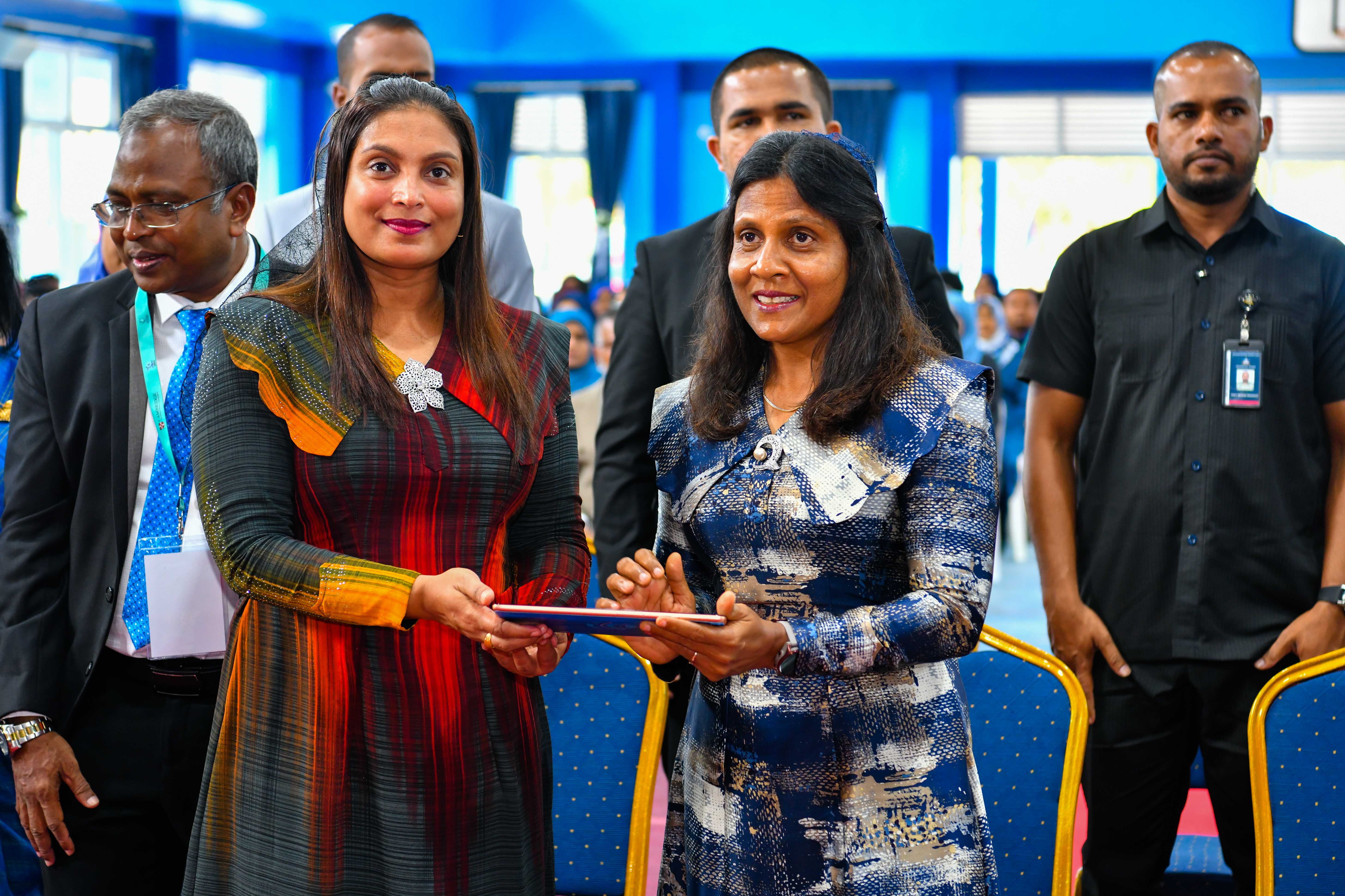 Before addressing the participants, the First Lady officially inaugurated the 6th International Teachers’ Conference held at Haa Dhaalu Atoll Education Center in Kulhudhuffushi City. She was also presented with a plaque of appreciation by the Ministry of Education.