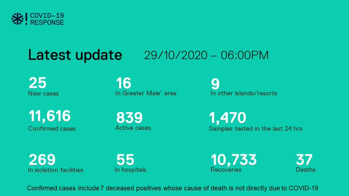 October 29th; the Health Protection Agency (HPA) of the Maldives reports 25 positive cases from 1,470 samples taken within 24 hours. This includes 16 Maldivians and 09 Foreigners.
