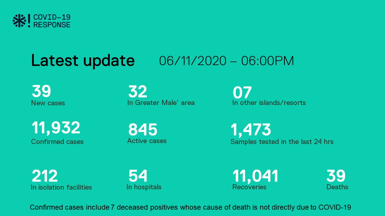 November 6th; the Health Protection Agency (HPA) of the Maldives reports 39 positive cases from 1,473 samples taken within 24 hours. This includes 20 Maldivians and 19 Foreigners.