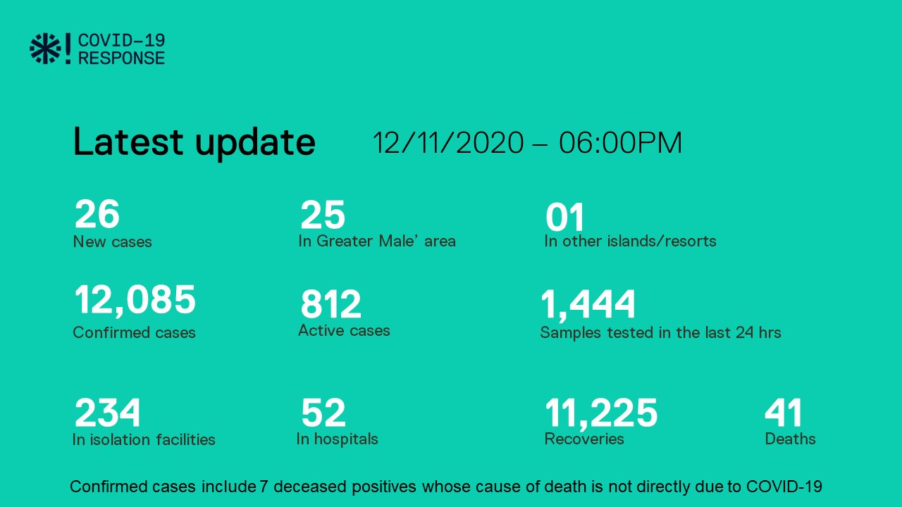 November 12th; the Health Protection Agency (HPA) of the Maldives reports 26 positive cases from 1,444 samples taken within 24 hours. This includes 16 Maldivians and 10 Foreigners.