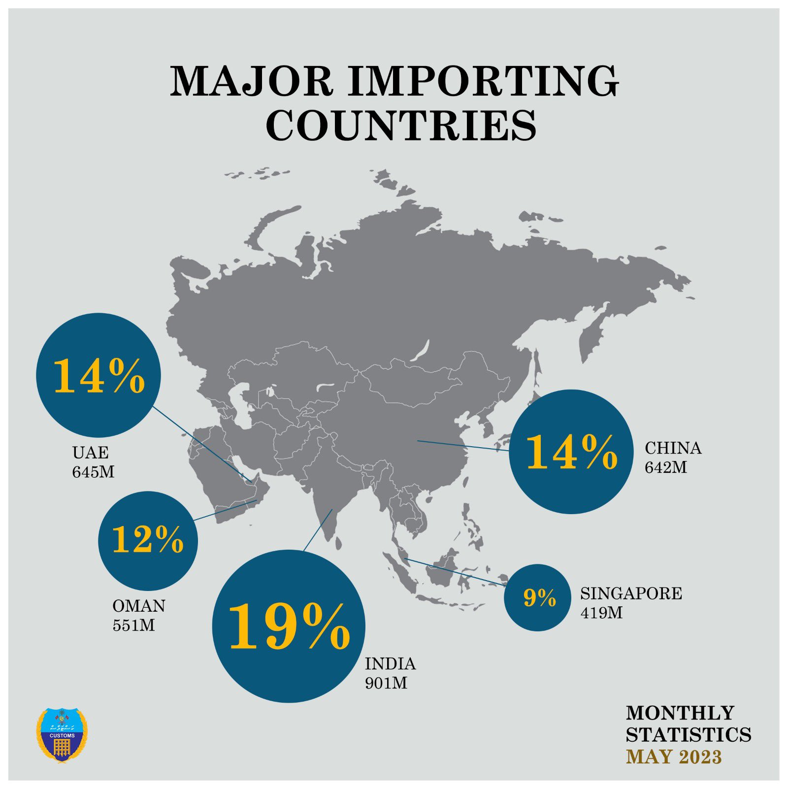 Last month’s major exporters to Maldives were India, UAE, China, Oman and Singapore. Rufiyaa figures for goods imported in May 2023 from the above countries are as follows: India - 901 million, UAE - 645 million, China - 642 million, Oman - 551 million and Singapore – 419 million.