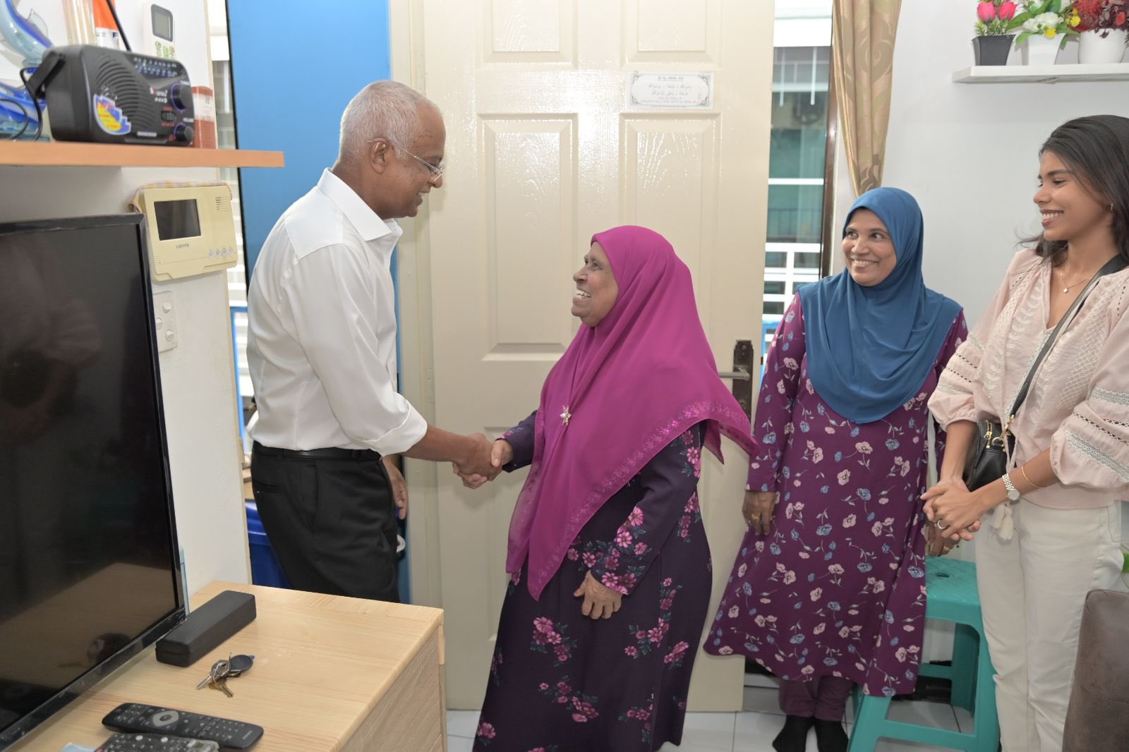 In his door to door campaign activity for yesterday, President Solih visited households in the South Galolhu Constituency and was accompanied by MP Meekail Ahmed Naseem who represents the electorate at the People’s Majlis, Minister of Defence Mariya Ahmed Didi and other MPs and many ordinary members of ruling Maldivian Democratic Party (MDP).