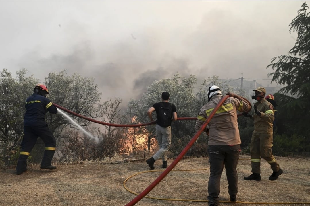 While firefighters battled numerous fires across the nation on Thursday, a wildfire fueled by powerful winds set off a sequence of enormous explosions at an air force weapons storage in central Greece.