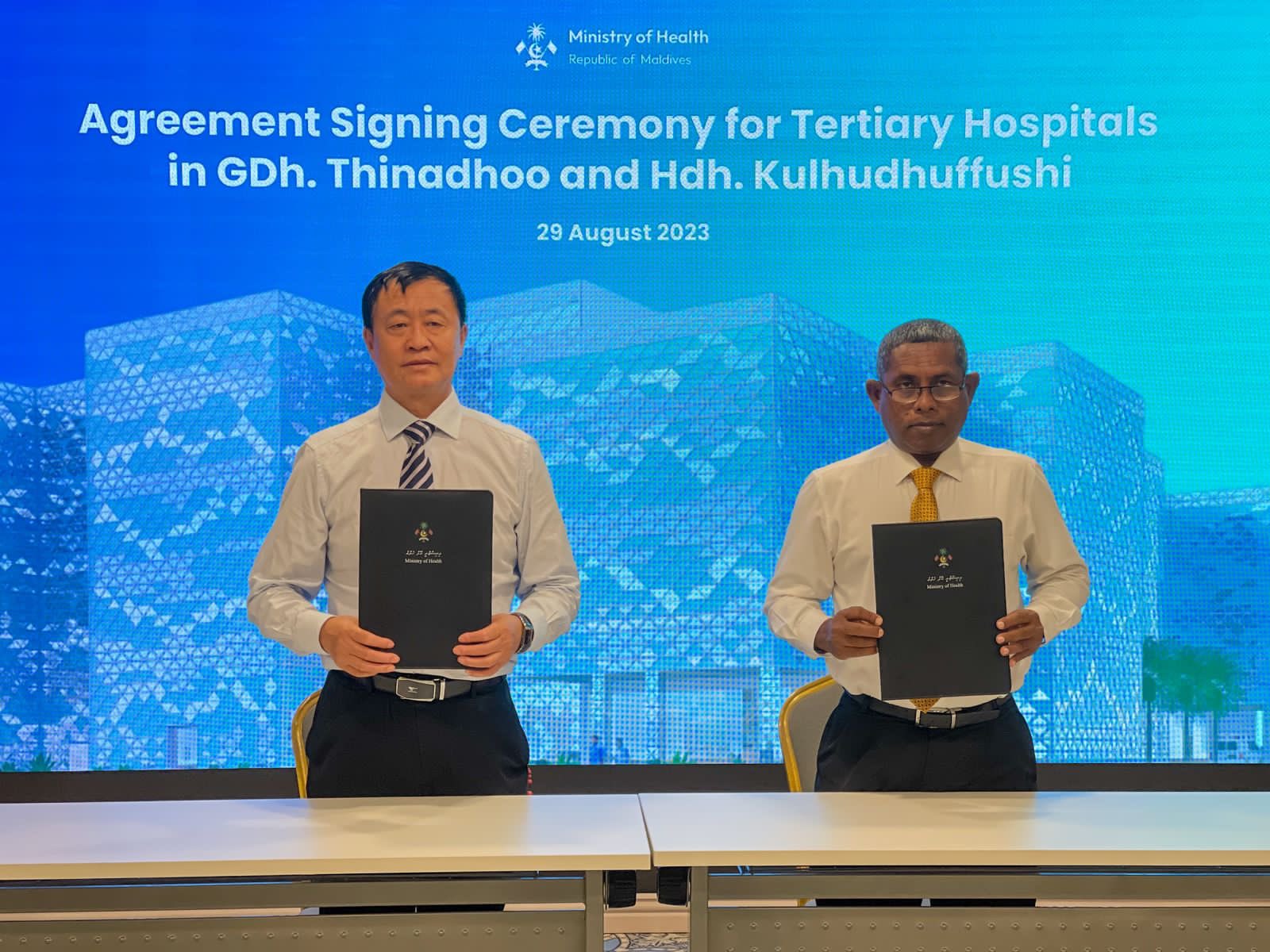 The Ministry of Health on behalf of the Government of the Maldives on Tuesday awarded the hospital development projects with 100 beds each on Kulhudhuffushi and Thinadhoo to China National Electric Engineering Company (CNEEC).