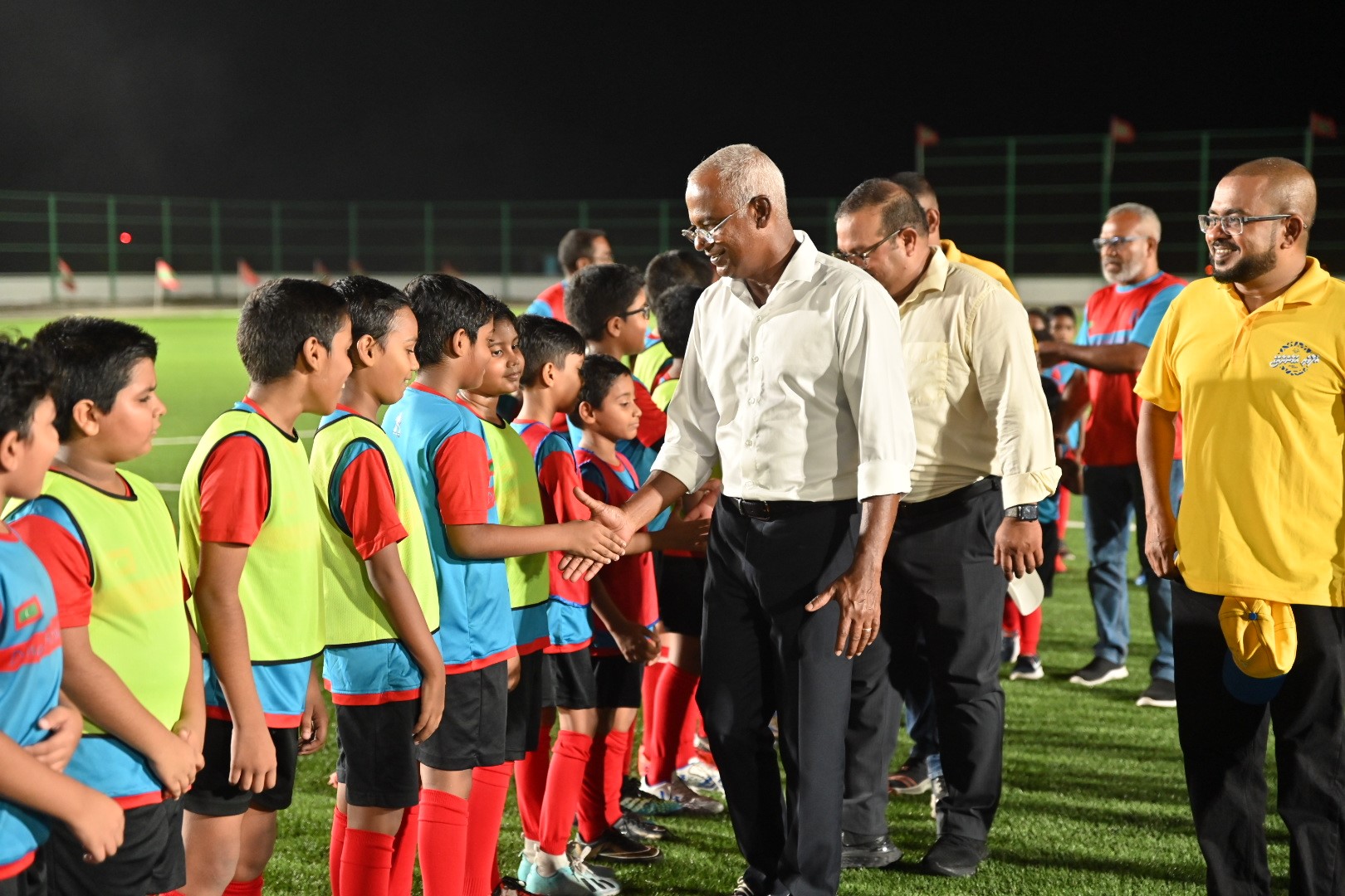 President Ibrahim Mohamed Solih officially inaugurated the newly constructed football ground on Feydhoo Island in Addu City. The inauguration took place on Wednesday during the President's visit to Feydhoo Island in Addu City.