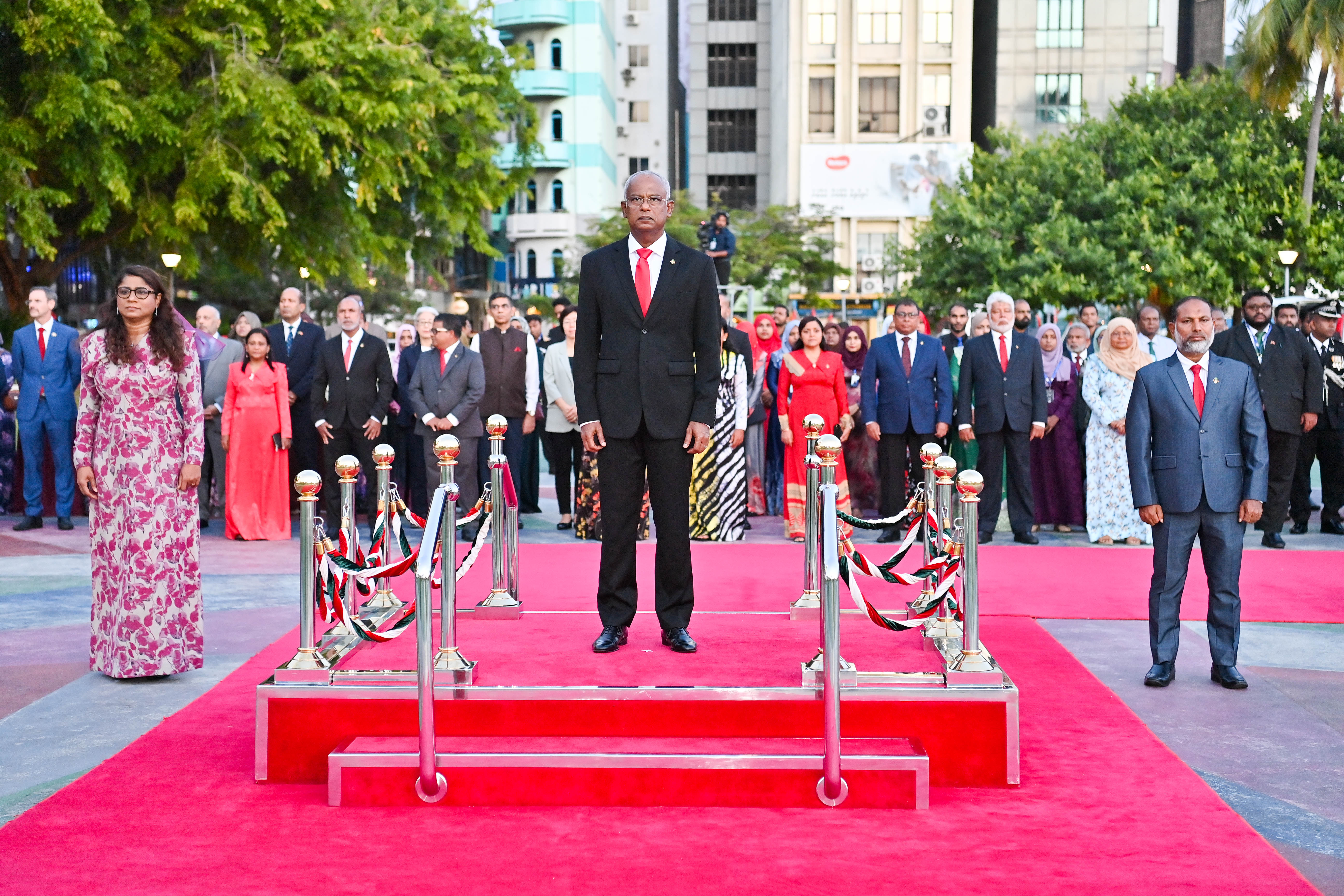 President Ibrahim Mohamed Solih and First Lady Fazna Ahmed attended the flag ceremony marking National Day 1445 on Saturday. The event was held at Republic Square and began at 6 a.m. today. They were accompanied by cabinet ministers and officials from government offices.