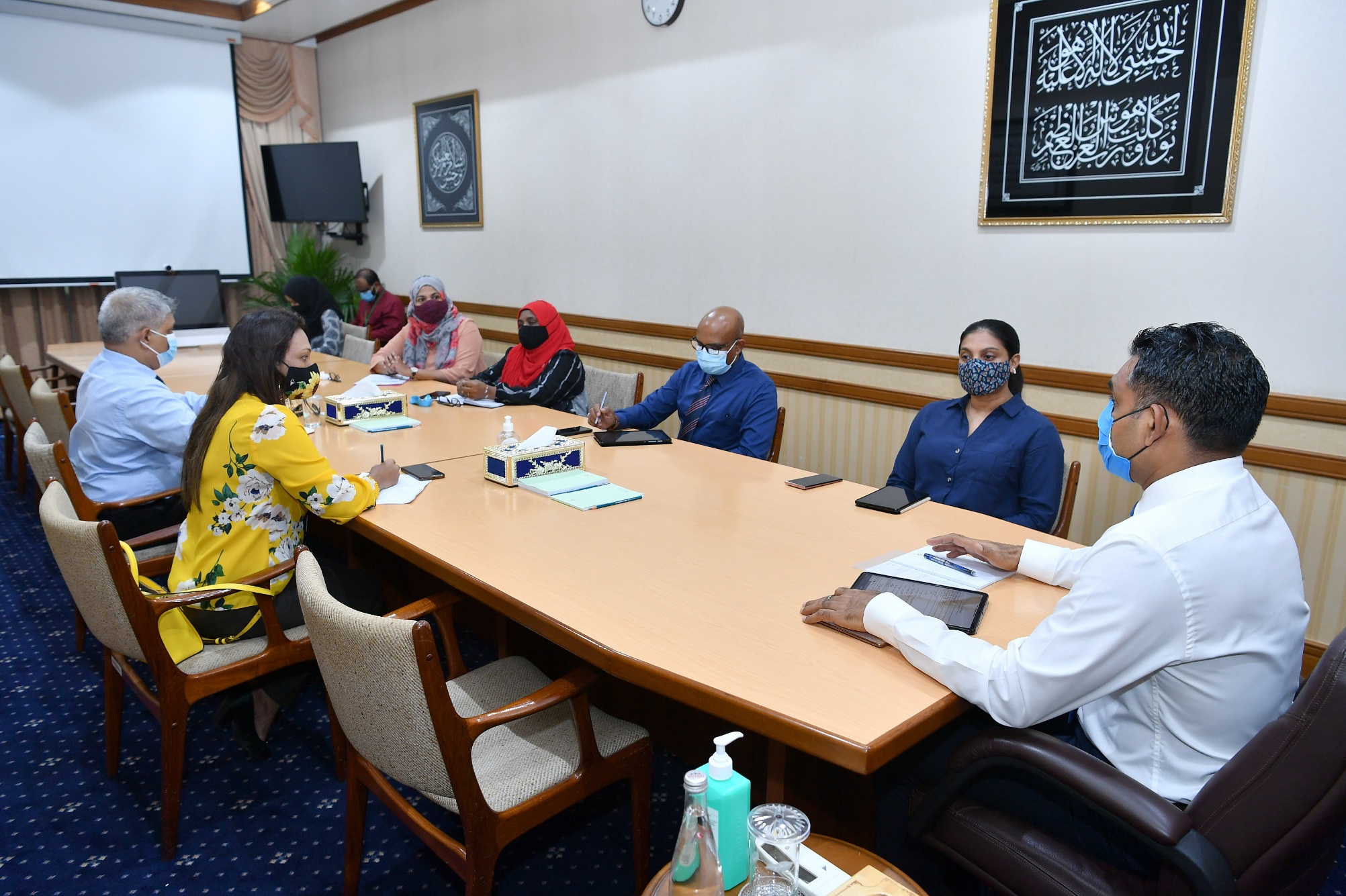 Vice President Faisal Naseem was joined at the meeting by the Minister of Education, Dr Aishath Ali, and Minister at the President's Office, Ahmed Sameer. The meeting was also attended by Senior Officials from the Ministry of Gender, Family and Social Services, MNU and IGMH.