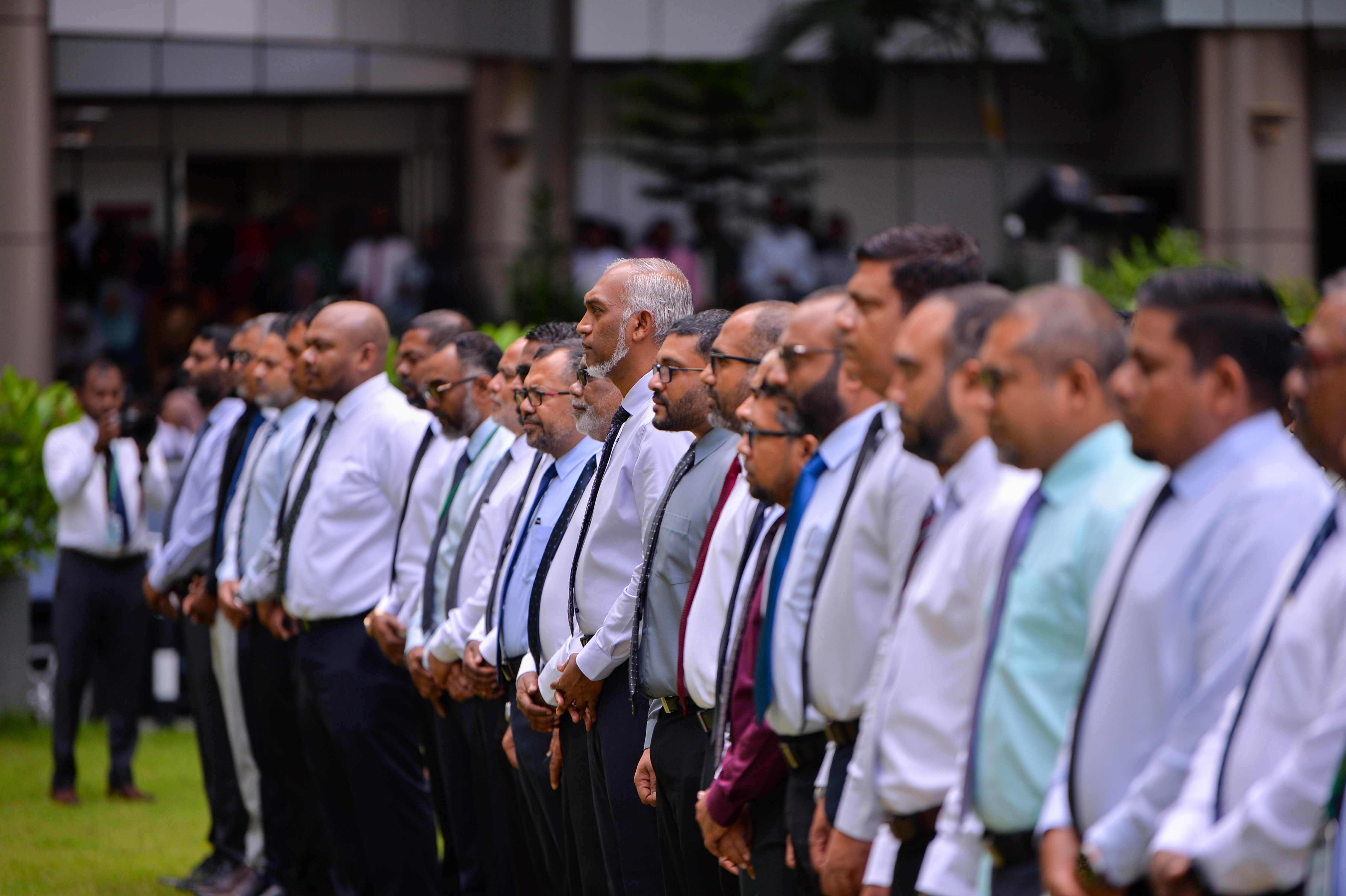 The President was accompanied by Cabinet Ministers, senior government officials, and President's Office staff in the grass field south of the President's Office, the site of the former Huravee Building. Several government employees in Malé City participated in the minute of silence in the street close to their workplaces.
