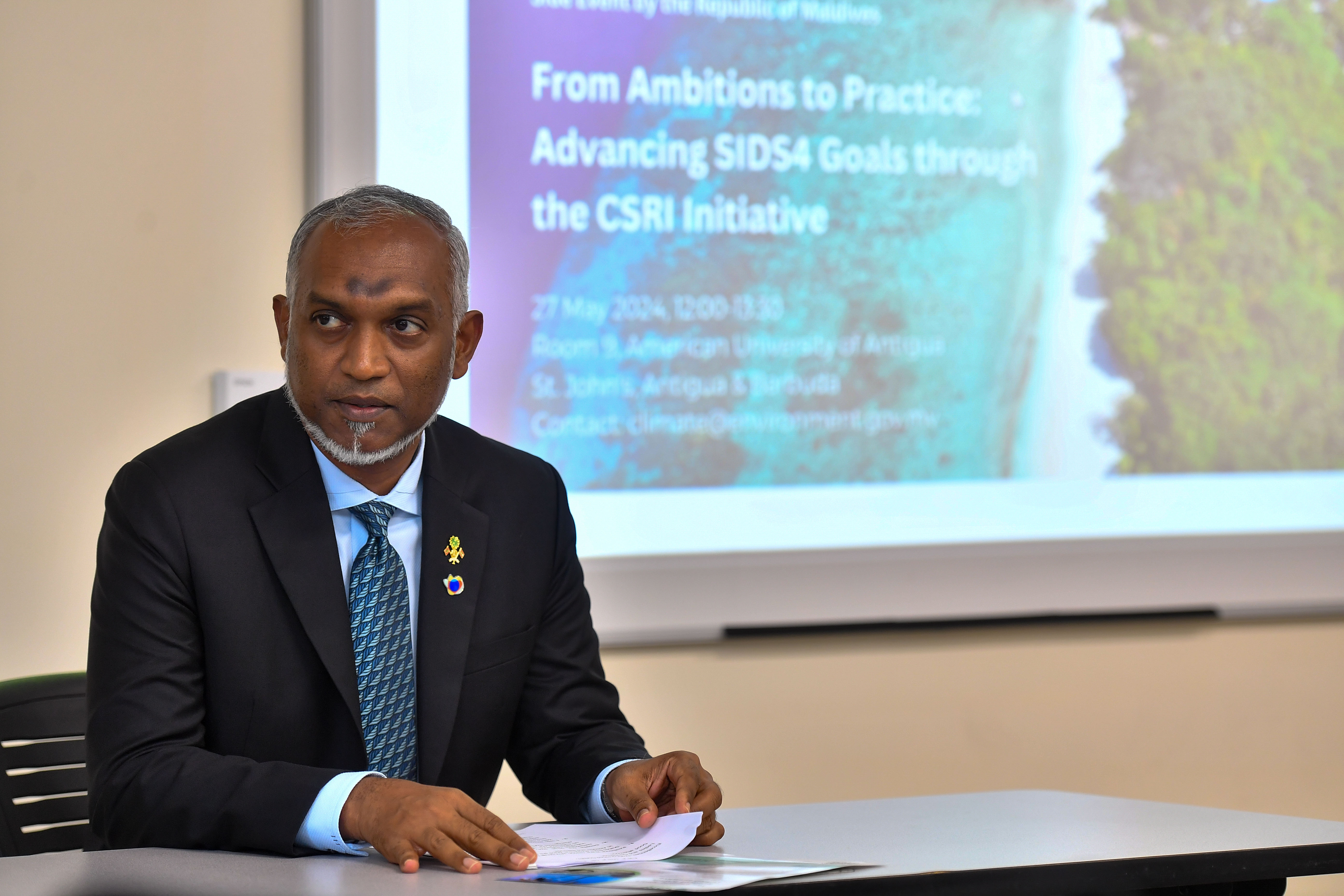 President Dr. Mohamed Muizzu has called on Small Island Developing States (SIDS) and international stakeholders to explore collaborative partnerships to transform SIDS4's ambitious objectives into tangible climate action. He made these remarks during his keynote address at the side event "From Ambition to Practice: Advancing SIDS4 Goals Through the Climate Smart Resilient Island (CSRI) Initiative" at the Fourth International Conference on SIDS (SIDS4).