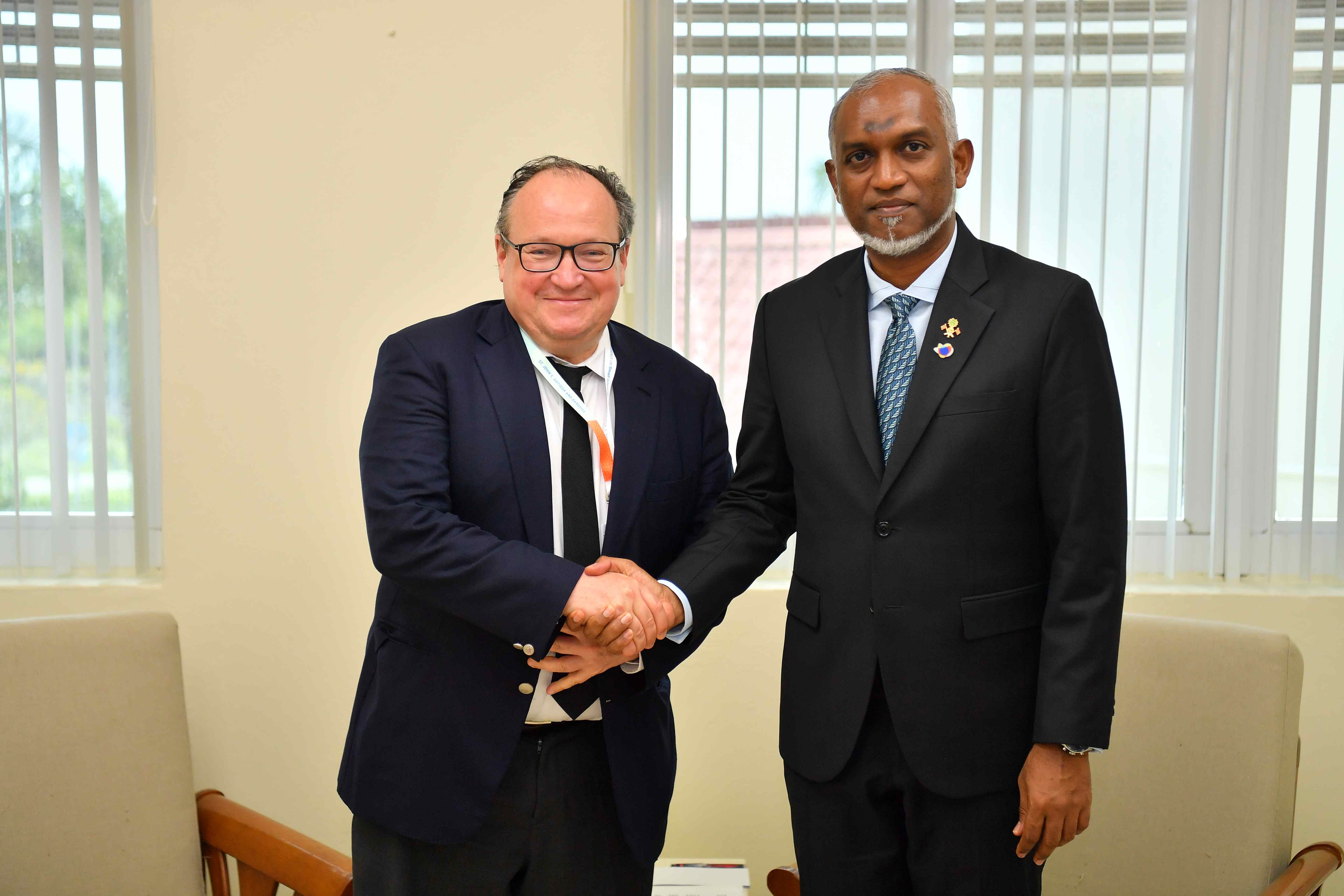 President Mohamed Muizzu met with Mr. Ambroise Fayolle, Vice President of the European Investment Bank (EIB), on the sidelines of the Fourth International Conference on Small Island Developing States (SIDS4). The meeting focused on enhancing cooperation between the Maldives and the EIB.