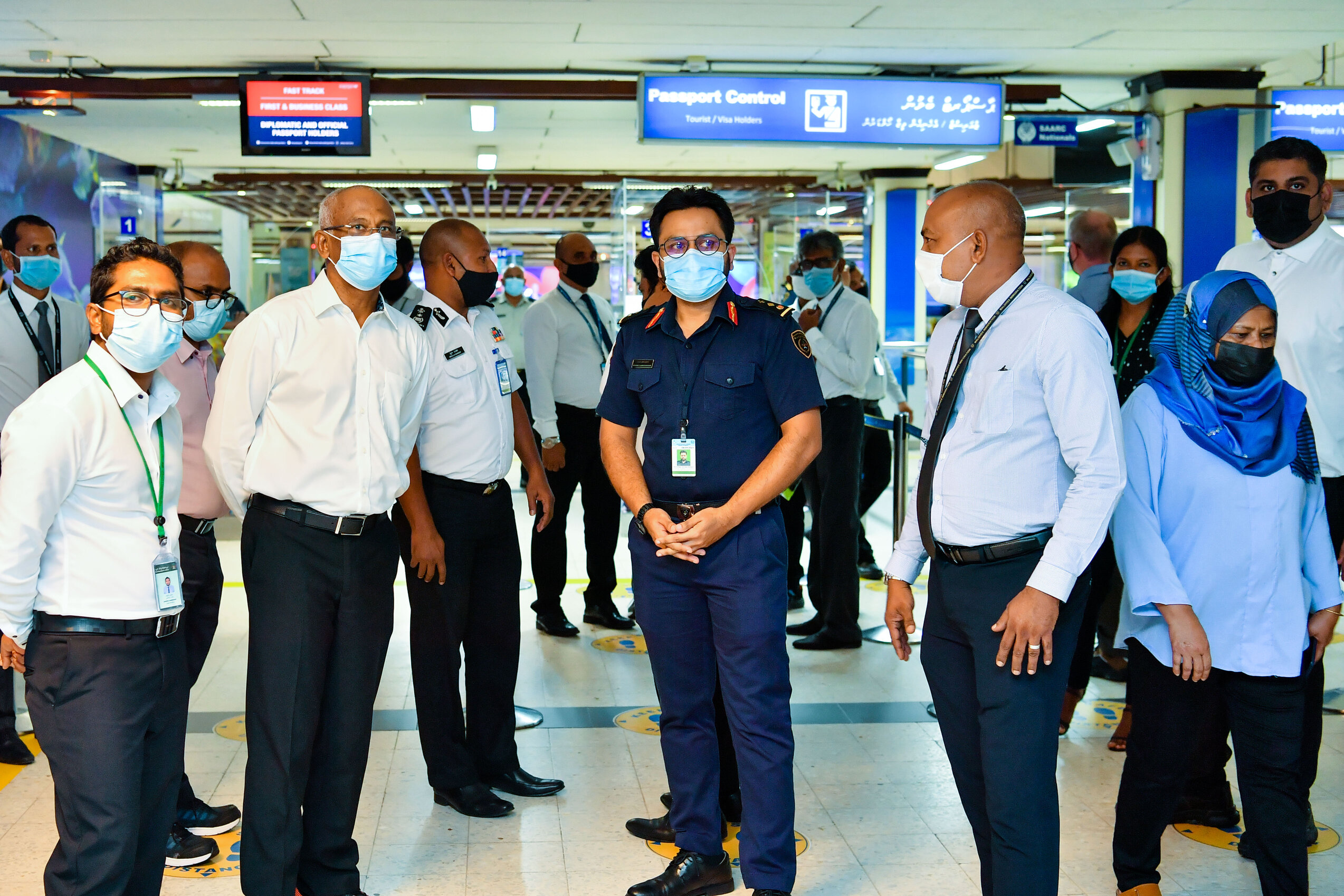 During the visit, President Solih met senior officials of Maldives Airports Company Limited (MACL), Maldives Customs Service, and Maldives Immigration, inquiring about their operations. He discussed with them ways of enhancing the services further and resolving the challenges facing the operation.
