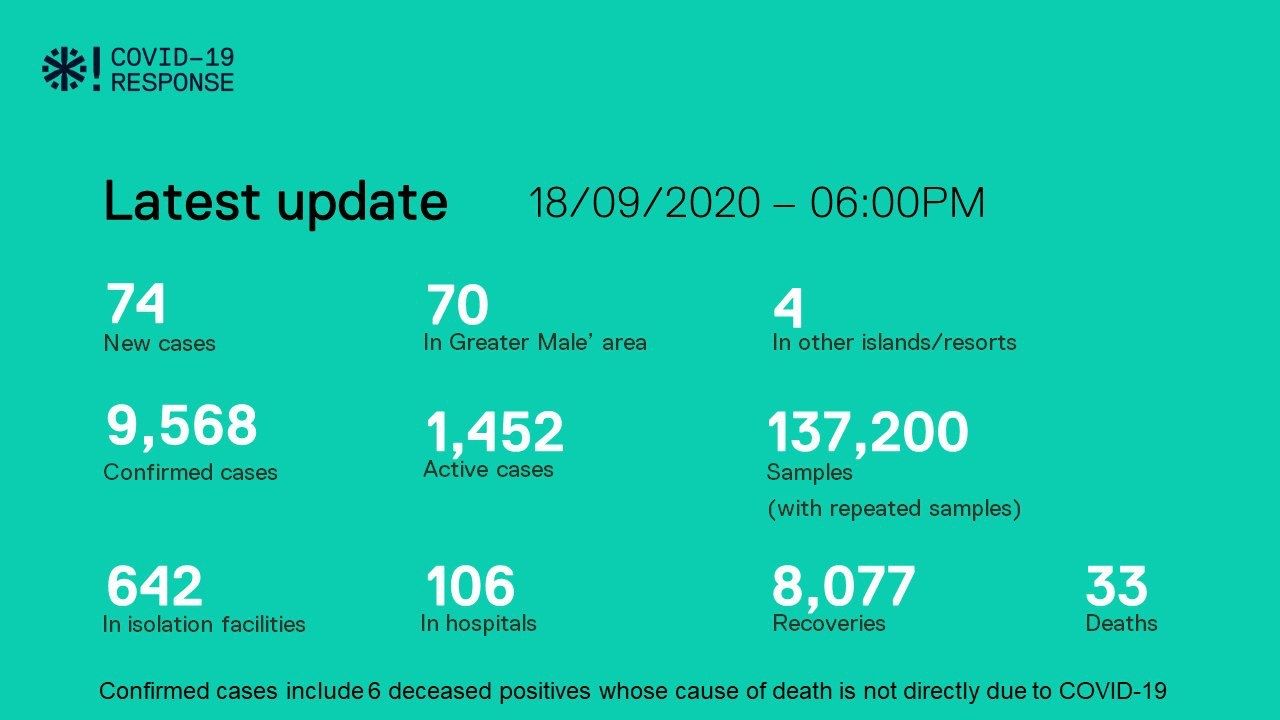 September 18th; (HPA) Health Protection Agency of the Maldives; reports 74 positive cases within 24 hours. This includes 37 Maldivians and 37 Foreigners.