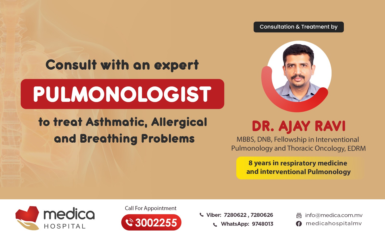 ކިމްސް ހެލްތު، ޓްރިވެންޑްރަމްގެ ލީޑިން ޕަލްމޮނޮލޮޖިސްޓް ޑރ. އަޖޭ ރަވީ، މެޑިކާ ހޮސްޕިޓަލުގައި ބަލިމީހުން ބައްލަވަން ހަމަޖެހިފައިވަނީ، އޮގަސްޓް މަހުގެ 8 އަދި 9 ވަނަ ދުވަހުއެވެ. އެގޮތުން ޑރ. އަޖޭއަށް ދެއްކުމަށް އެޕޮއިންޓްމަންޓް ހެއްދުމަށާއި، އިތުރު މަޢުލޫމާތު ހޯއްދެވުމަށް މެޑިކާ ހޮސްޕިޓަލުގެ ކޯލް ސެންޓަރ (3002255)، ވައިބަރ (7280622، 7280626) ނުވަތަ ވަޓްސްއެޕް (9748013) މެދުވެރިކޮށް ގުޅާލެވޭނެއެވެ.