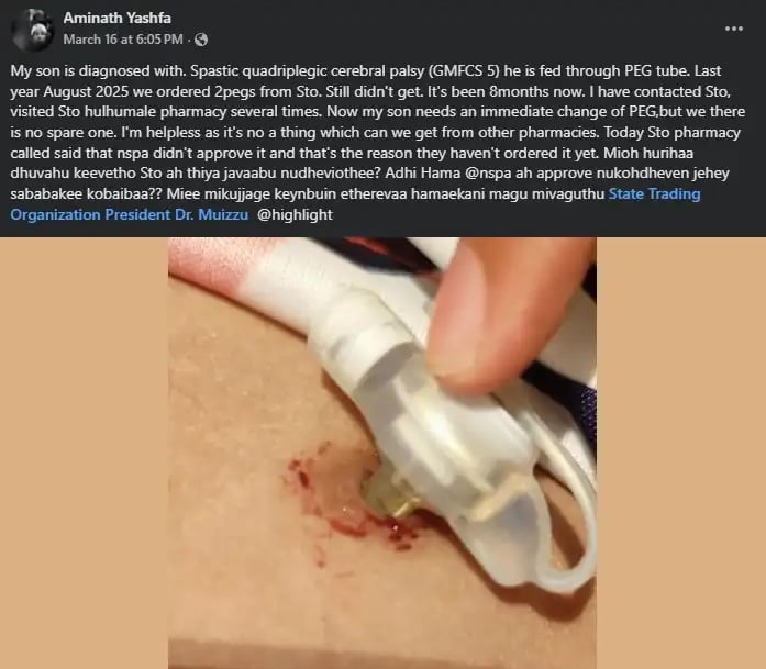 ކެއިންބުއިމަށް ބޭނުންވާ މުހިންމު ހޮޅިކޮޅެއް އެންސްޕާ މެދުވެރިކޮށް ގެނައުމުގެ ހުއްދަ ނުލިބި އަށް މަސް ދުވަސް ވަންދެން މަޑުކުރަން ޖެހުމުގެ ސަބަބުން، ބަލި ހާލަތުގައި އޮތް ކުޑަކުއްޖަކު ނިޔާވެއްޖެއެވެ.