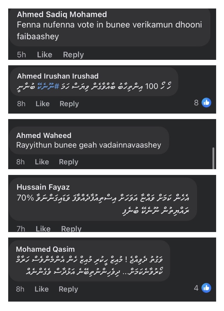 އިތުރު ކޮމެންޓުތަކުގެ ތެރޭގައި ހިމެނޭ "ވަގުތު ދެވިއްޖެ! މުއިއްޒު ހީކުރީ މުއިއްޒުހެން އެންމެން ހަރާމް ކޯރުވާނެ ކަމަށް. ދިވެހިން ނުތިބޭނެ އަޅުދާސް ވެގެން" ފަދަ ބަސްތަކުން ދޭހަވަނީ ރައްޔިތުންގެ ކެތްތެރިކަން ކޮޅުންލާފައިވާ މިންވަރެވެ. ގިނަ ބަޔަކު ގަބޫލުކުރާ ގޮތުގައި 70 އިންސައްތަ ރައްޔިތުން ސަރުކާރަށް "ނޫނެކޭ" ބުނުމަކީ ވެރިކަމުގައި ދެމިހުރުމުގެ ގާނޫނީ އަދި އަޚްލާގީ ހައްގު ގެއްލުން ކަމެކެވެ.